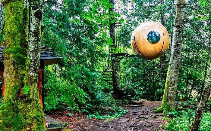 En los árboles del bosque costero de Vancouver Island, en Canadá, hay tres casas de árbol esféricas en las que puedes pasar la noche sin ningún problema, bueno casi ningún problema, el baño se encuentra a nivel del piso.