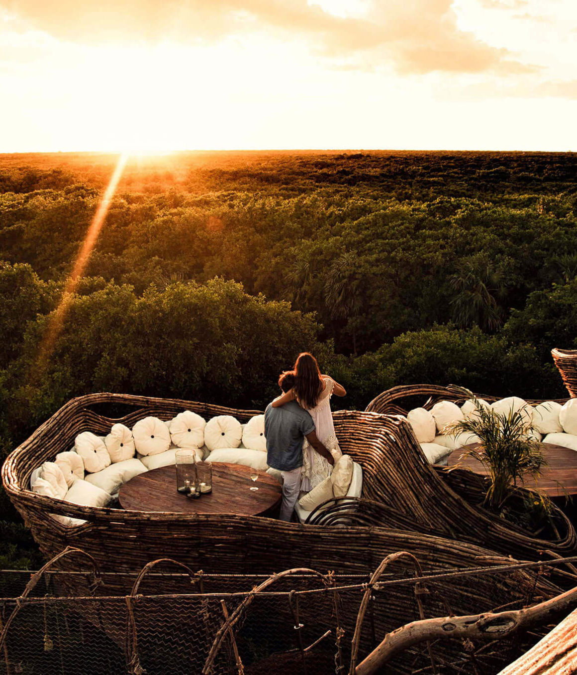 Kin Toh es un entramado de nidos en los árboles unidos por pasarelas de madera que desafían tu vértigo pues está construido a 12 metros de altura. Una loca estructura arquitectónica donde puedes cenar y ver los mejores atardeceres de México.