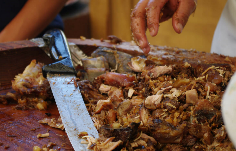 Este delicioso plato se originó desde la época de los Mayas y consiste en envolver en hojas de plátano carne de cerdo adobada con achiote. Una vez envuelta la carne se pone a cocinar en un horno de tierra y, al momento de servirla, se acompaña con una salsa de cebolla morada y chile habanero.