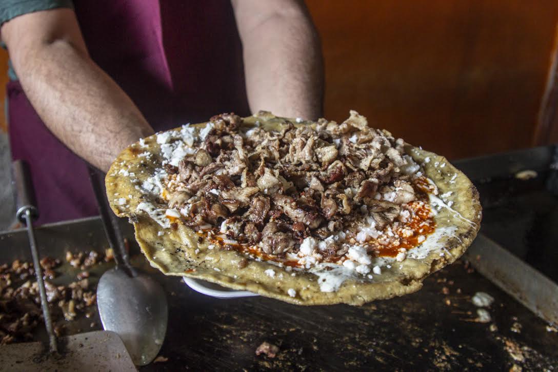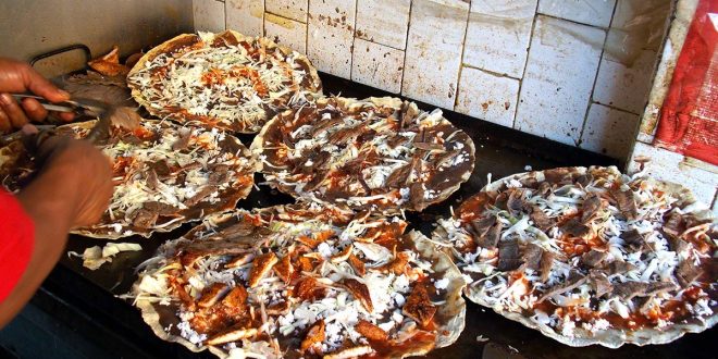 Es muy típica del estado de Oaxaca y es una tortilla enorme con múltiples ingredientes como frijoles negros, col, lechuga, tasajo, cecina de puerco, chorizo de puerco, carne seca, quesillo y salsa picante.