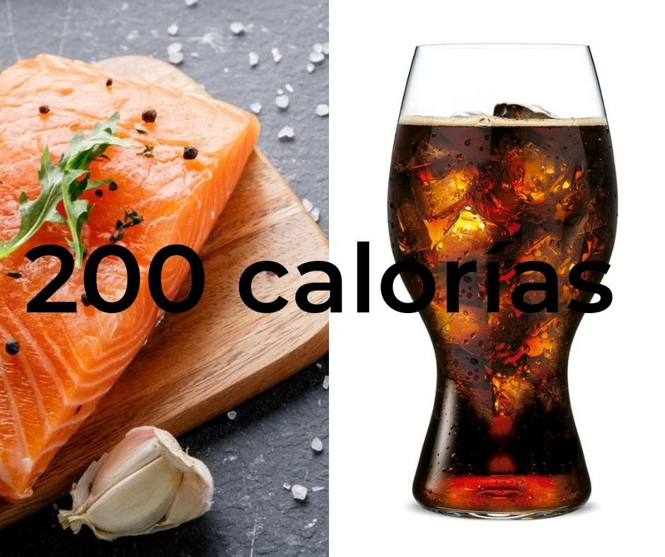 Un vaso de la bebida Coca Cola mediano tiene la misma cantidad de calorías que 100 gramos de salmón, que son 200 calorías.