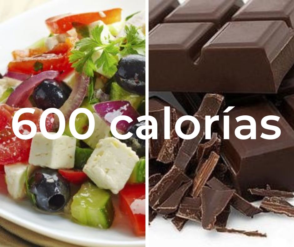 Pensar que una ensalada de lechuga, pepino, jitomate y cebolla tiene más calorías que una barra de chocolate parece una gran mentira, sin embargo es verdad, pues la ensalada griega alcanza unas 600 calorías, mientras que una barra de chocolate tiene 556.