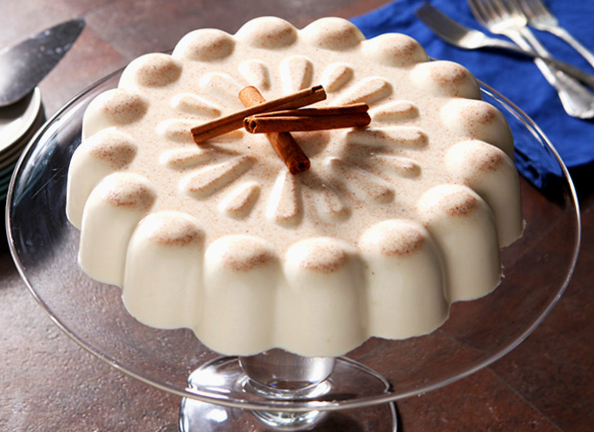 Al terminar cuela la mezcla anterior y vierte en un molde para gelatina, después refrigera hasta que cuaje. Finalmente desmolda y decora con las soletas y las varas de canela.
