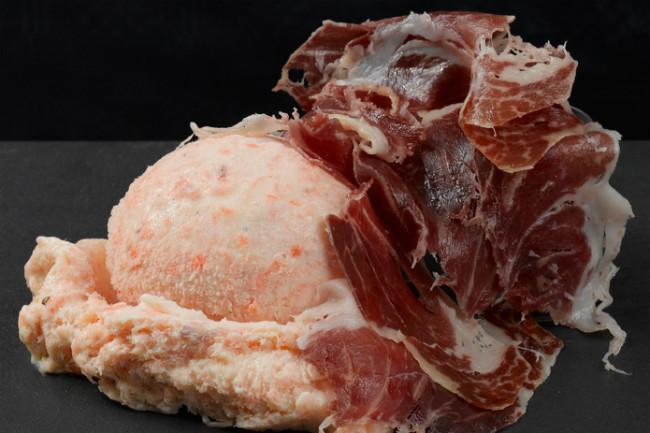 Es un helado cremoso de jamón y se suele servir en la alta cocina.
