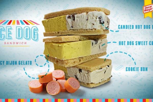 El “Ice Dog” está compuesto por trocitos de hot dog, más crema dulce de hot dog con helado de Dijon picante y dos galletas.