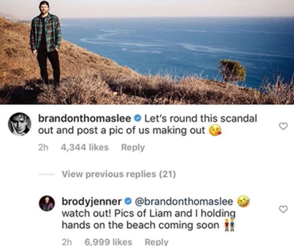 A su vez, Brandon Thomas Lee, su compañero en el reality The Hills, decidió tomar el hecho con algo de humor a poner en sus redes sociales el siguiente mensaje: “Demos la vuelta a este escándalo y publica una foto nuestra besándonos. Jenner no tardó en contestar con un: “¡Atención! próximamente fotos de Liam y yo tomados de la mano en la playa”.