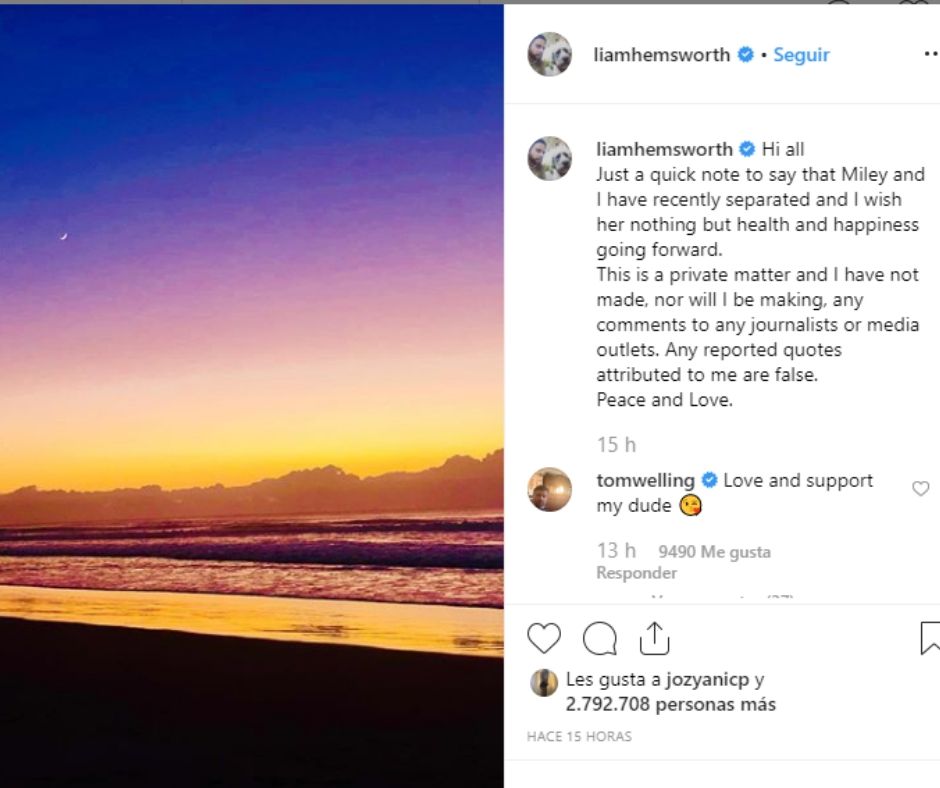 Por otro lado, Liam acaba de escribir en su Instagram, aclarando que no dirá nada sobre el asunto y siendo todo un caballero deseándole lo mejor a Miley Cyrus.