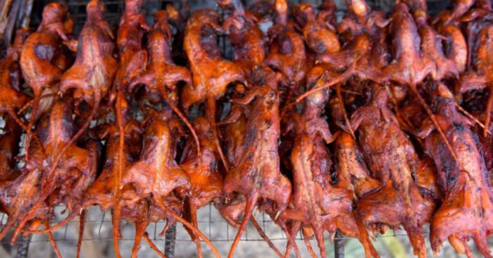 Este polémico platillo es cada vez más popular en las carreteras del oeste de Camboya, donde se prepara cocinado a las brasas por día. Quienes consumen su carne, aseguran que el animal está limpio y tiene un sabor parecido al pollo o cerdo.