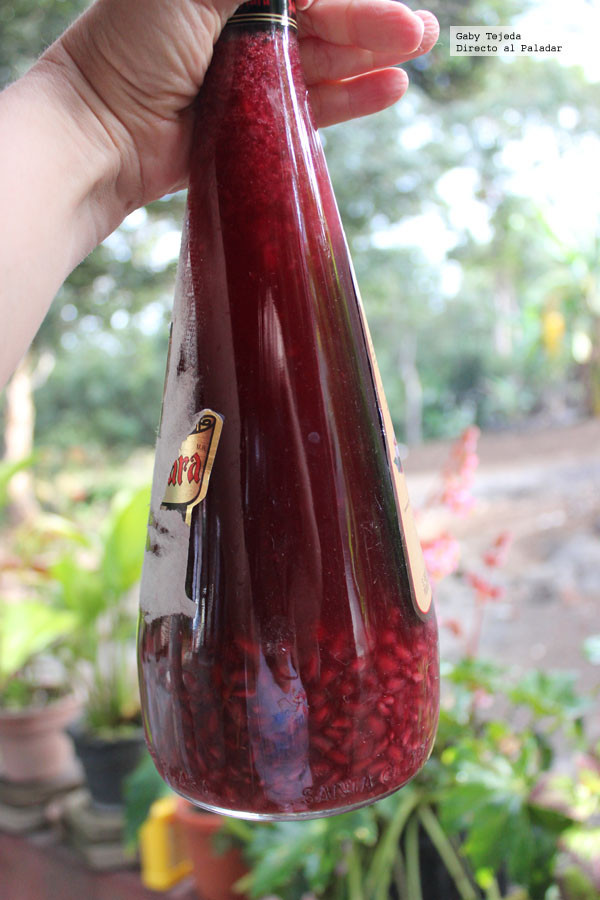 La preparación se inicia poniendo la fruta limpia ligeramente aplastada en una bolsa plástica para que no se pierda nada de jugo, luego debes vaciar todo a la botella desinfectada y seca, agregar alcohol hasta que se cubra y tapar. Una vez listo debes poner el recipiente en un lugar fresco y oscuro y dejar reposar hasta que las semillas de la granada se dividan en dos: unas quedan en la parte superior de la botella y otras en la inferior.