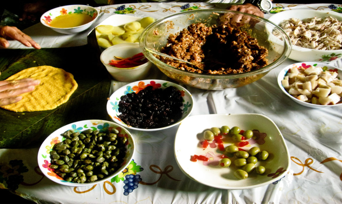 Es la reina de las navidades, su preparación tradicional lleva la masa amarilla de harina de maíz con un guiso de carne, pernil y gallina, alcaparras, pasas, aceitunas, cebolla, pimentón rojo y verde, sal y pimienta, y la hoja de plátano con pabilo para envolver esta explosión de sabores.