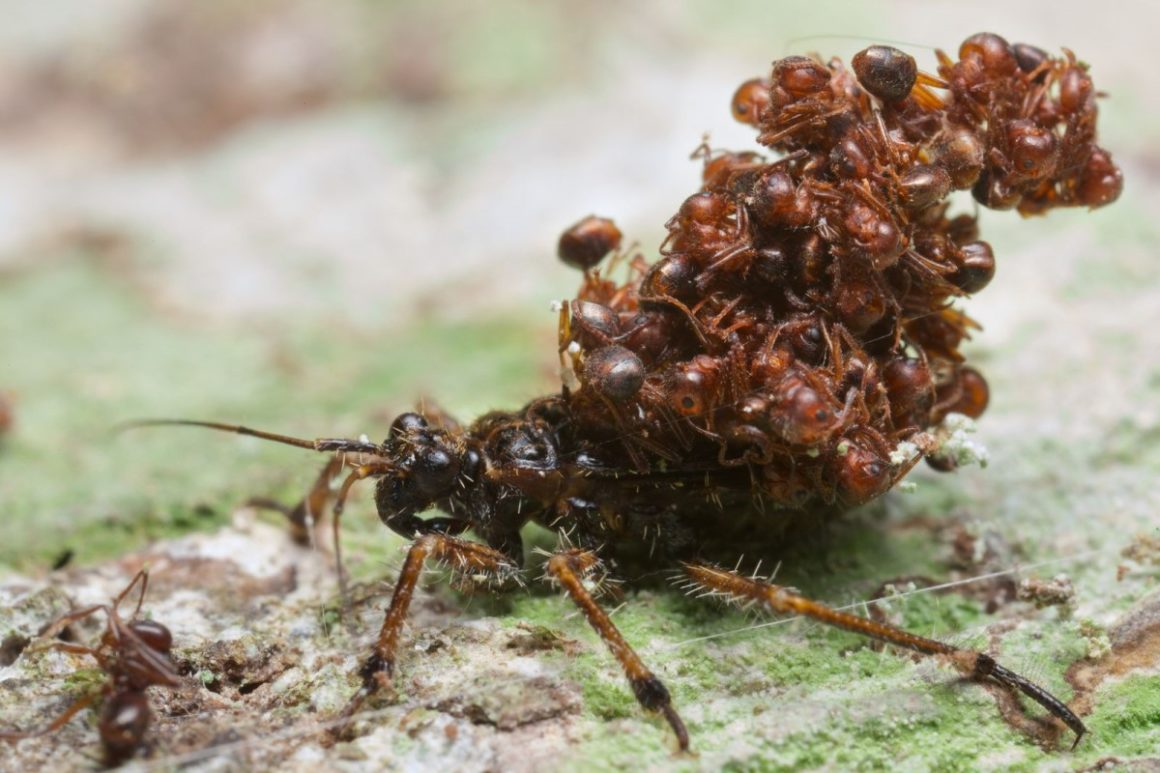 Se trata del Acanthaspis petax, un bicho pariente de las chinches y las cigarras, temiblemente conocido como el insecto asesino de Malasia. Este apodo no es ninguna exageración. Para alimentarse se mueve sigilosamente entre las hormigas, sus principales víctimas. Una vez que está cerca, las sujeta con sus patas y les inyecta su saliva, la cual las paraliza y les disuelve las entrañas. Después de que sus ‘tripas’ se vuelven una especie de ‘sopa’, los Acanthaspis simplemente la succionan. Cuando terminan, segregan una sustancia pegajosa que untan a los cadáveres para mantenerlos unidos en una especie de bola mortuoria.