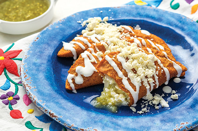 Estas enchiladas muy patrias contienen los colores de la bandera, ya que se combinan las verdes, rojas y crema. Cada tortilla se baña en las diferentes salsas y al momento de servirlas se acomodan de acuerdo a la bandera tricolor.
