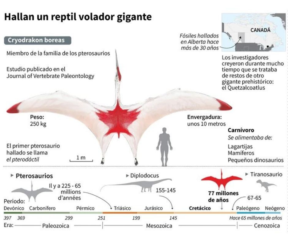 Primero, la criatura fue bautizada como Cryodrakon Boreas; los investigadores explicaron que este animal pertenece a los pterosaurios, mismos que fueron parte crítica de los ecosistemas de todo el planeta durante la era de los dinosaurios. Razón por la cual, son clave para comprender la ecología, los decesos y las evoluciones de la época.