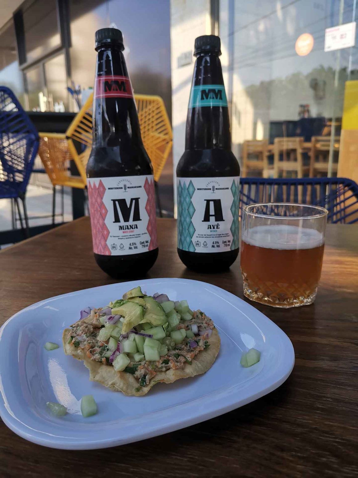 Por ahora, está disponible en dos etiquetas distintas: Ayé y Maxa. La primera es una witbier elaborada con malta de centeno y trigo, semillas de cilantro y cáscara de naranja. Y Maxa (se pronuncia maja) es una white stout, una cerveza de especialidad que evoca la cremosidad y notas tostadas de una stout a partir de granos de café y cacao chiapanecos, mientras que toma un característico color dorado de maltas caramelo.