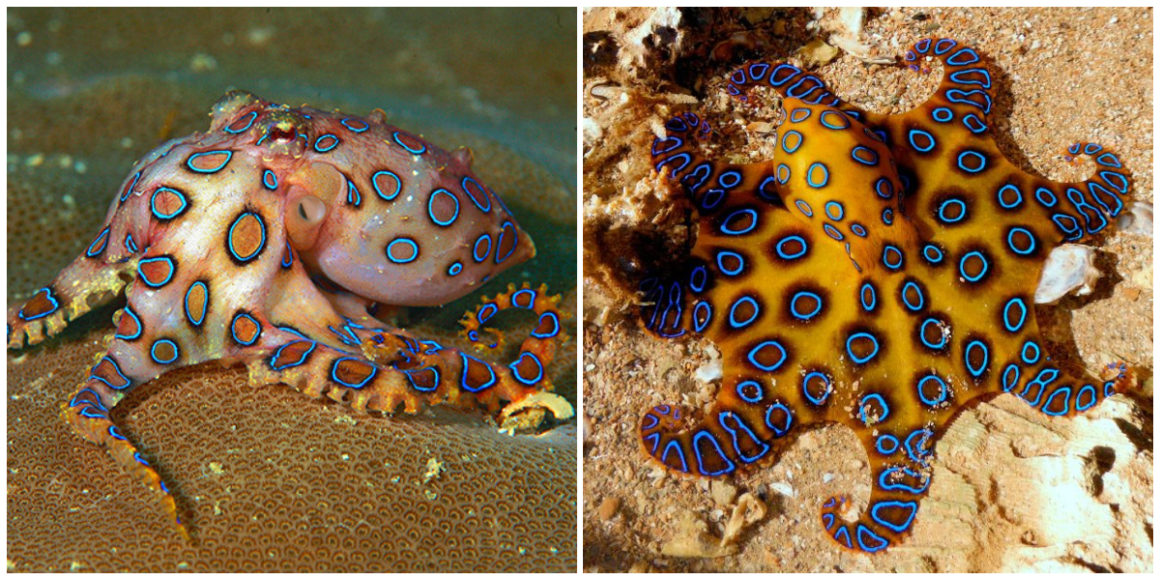 Esta magnífica criatura del tamaño de una pelota de golf habita en todas las costas de Australia. La mayoría de las picaduras son causadas porque los humanos tratan de tocarlo. Por desgracia, para aquellos que lo agarren, no sufrirán de dolor pero morirán rápidamente, debido a que la toxina de este pulpo es 10,000 veces más potente que el cianuro, pudiendo matar a un humano en menos de 90 minutos.
