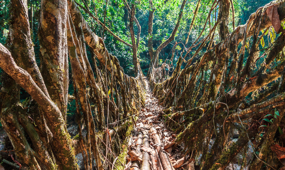 Este es uno de los lugares más húmedos del planeta, en donde las mismas raíces de los árboles crean puentes naturales que son dignos de un cuento de hadas.