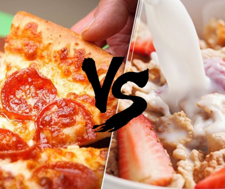 El cereal contiene grandes dosis de azúcar, mientras que la pizza (pese a tener mayor cantidad de grasa), al ser rica en proteína te brinda una mayor sensación de saciedad y evita que comas entre horas, además, claro, ¡Es deliciosa!