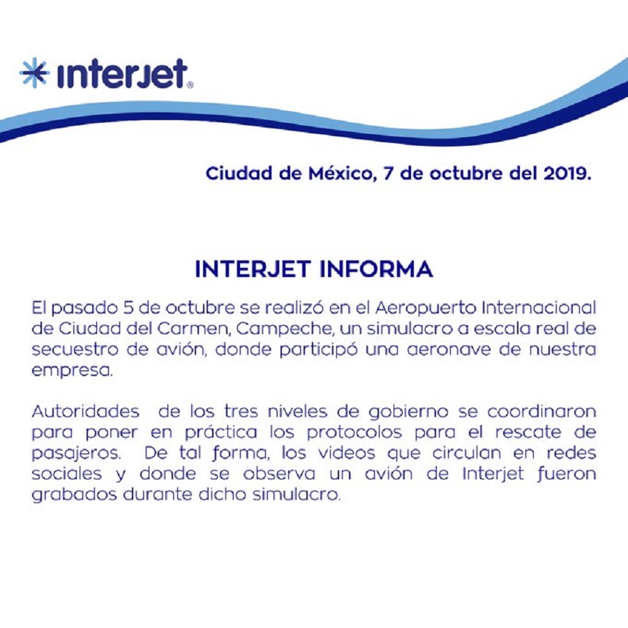 Además, Interjet lanzó un comunicado a través de sus redes sociales para esclarecer el asunto y desaparecer los rumores. De manera que, la aerolínea afirmó que las grabaciones son parte de un simulacro y no deben ser confundidos con un hecho real.