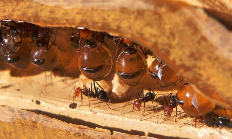 Es muy interesante que estas hormigas que no pueden volar hacia las flores, chupar su néctar y produzcan miel, pero lo hacen porque las hormigas obreras estériles encargadas de acumular miel reciben el alimento por parte de sus otras compañeras obreras, que las van rellenando con los jugos que recogen por la noche en las plantas.