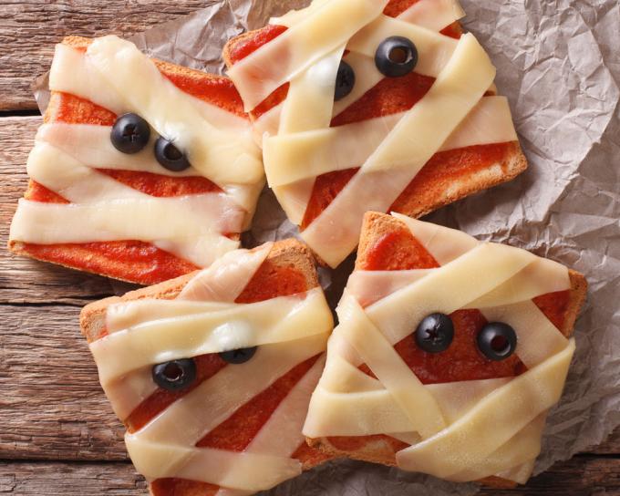 Con una rebanada de pan tostado, jitomate molido y queso puedes hacer unas ricas momias de pan. Si quieres puedes utilizar un par de aceitunas negras para hacer los ojos.