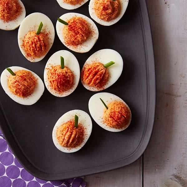 Puedes hacer unos sencillos huevos rellenos y cortarlos por la mitad para darles forma de calabaza con un rabito de cebollino a la yema.