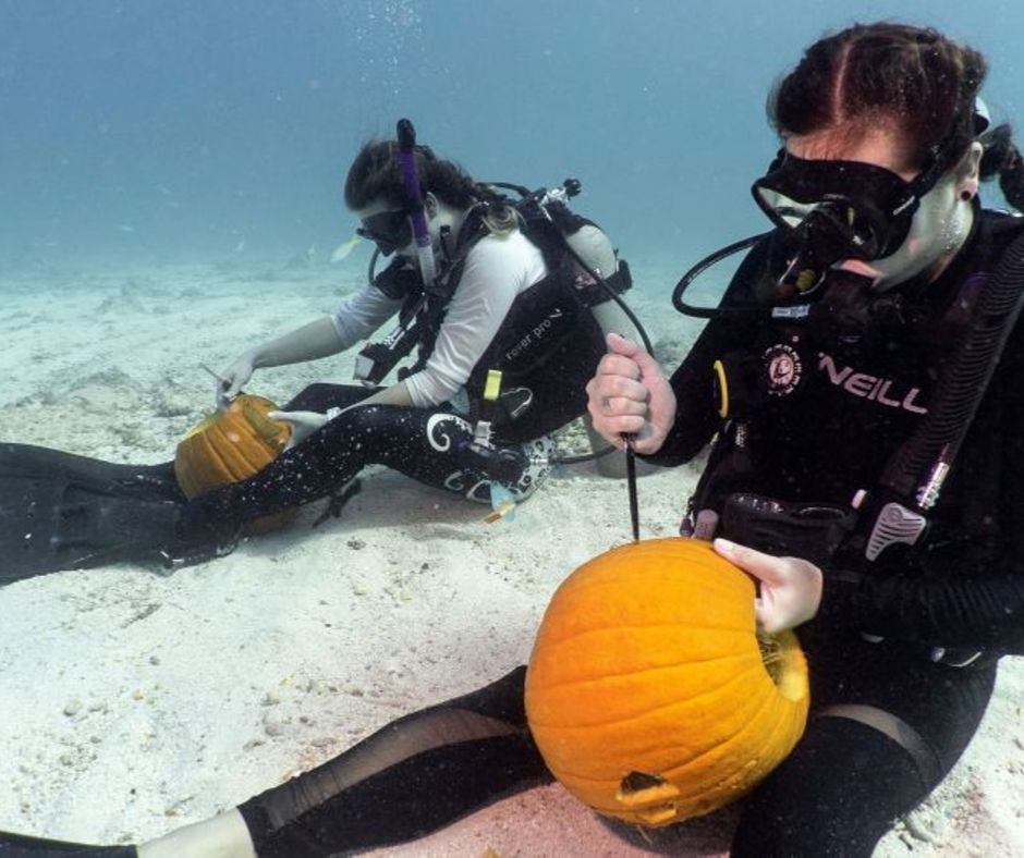 El concurso para tallar la calabaza bajo el agua se puede realizar de manera individual o en equipo. Cada año los buzos eligen como será su participación y se reúnen en este lugar de Florida para evitar salir a flote mientras esculpen sus calabazas.