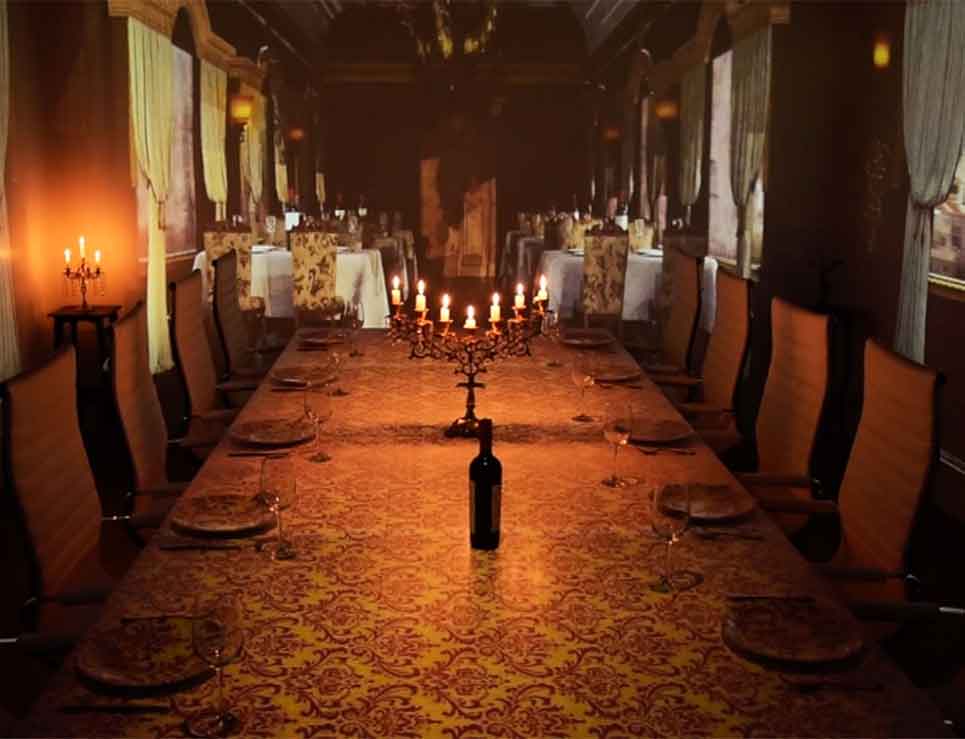 Para vivir completa esta experiencia debes estar preparado para no salir durante al menos las dos horas que dura la cena. El lugar es una habitación hecha en el restaurante del Colegio Superior, donde se guarda el videomapping que es uno de los protagonistas. Esta técnica consiste en colocar varios proyectores con la finalidad de mostrar sobre algunas superficies dibujos, fotos, paisajes y todo lo que puedas imaginar.