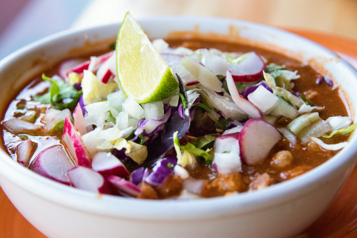 Una vez listo, el maíz se agrega a un caldo con pollo o cerdo deshebrado, que se adereza con lechuga, cebolla, orégano, limón, rábano, chile y tortillas tostadas. En el transcurso de la historia este guisado ha tenido modificaciones a partir de los ingredientes y gustos de cada región. Por ejemplo, en el estado de Guerrero se le agrega tomate verde, en Michoacán chicharrón, en Colima queso blanco, en Jalisco cerdo y chile ancho, y en las zonas costeras sardinas.