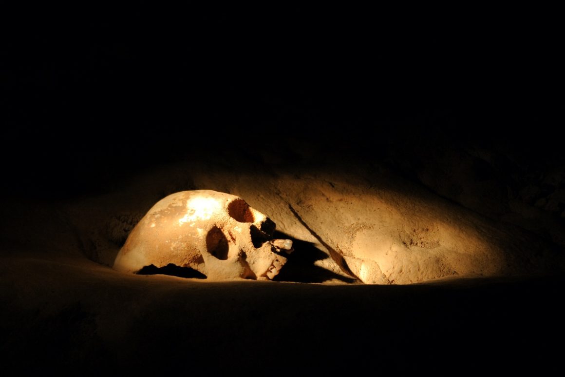 La Cueva Actun Tunichil Muknal, es escalofriante, porque para poder entrar a ella, debes nadar a oscuras durante el primer tramo y el agua helada lo hace más escalofriante. Al llegar a tierra encontrarás esqueletos reales sobre la arena, mismos que fueron utilizados en sacrificios mayas.
