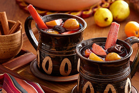 En México, su preparación se hace con caña de azúcar, ciruela pasa, manzana, canela y piloncillo. También lleva tejocote y guayaba, y es común servirlo caliente o frío en jarritos de barro.