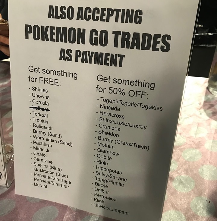 Dentro del juego se puede realizar un intercambio de Pokemones, por lo cual los bares decidieron que algunos de estos ejemplares podrían servir para pagar los tragos en el mundo real.