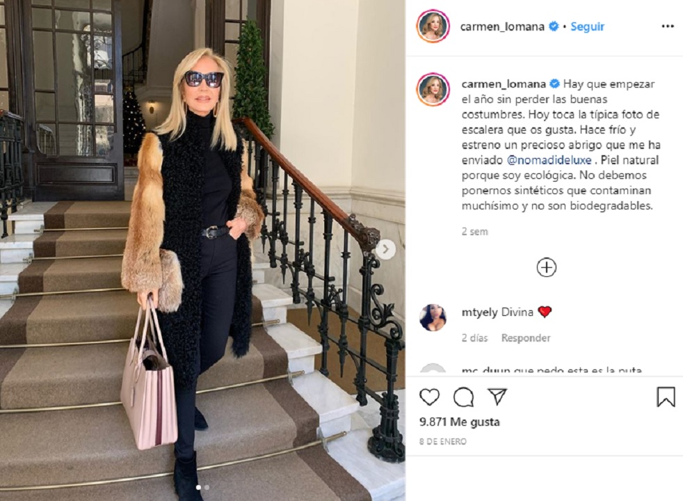 La celebridad española Carmen Lomana subió una foto en su instagram luciendo estupenda con uno de sus muchos abrigos de piel, no es la primera ocasión en la que la estrella lo hace, sin embargo en con esta foto movió las redes sociales e hizo enfurecer a usuarios animalistas en todo el mundo.