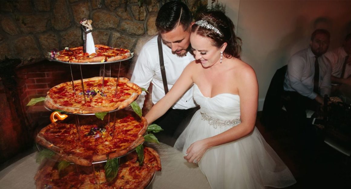 Su pastel matrimonial fueron varias pizzas de diversos ingredientes sostenidas una sobre la otra. La ventaja de su elección es que tanto ellos como sus invitados pudieron disfrutar de este divertido pastel poco tradicional.