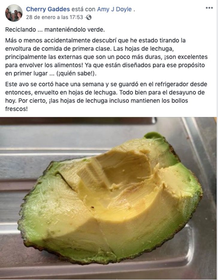 “Accidentalmente descubrí que he estado tirando la envoltura de comida de primera clase. ¡Las hojas de lechuga, principalmente las externas que son un poco más duras, son excelentes para envolver los alimentos!”