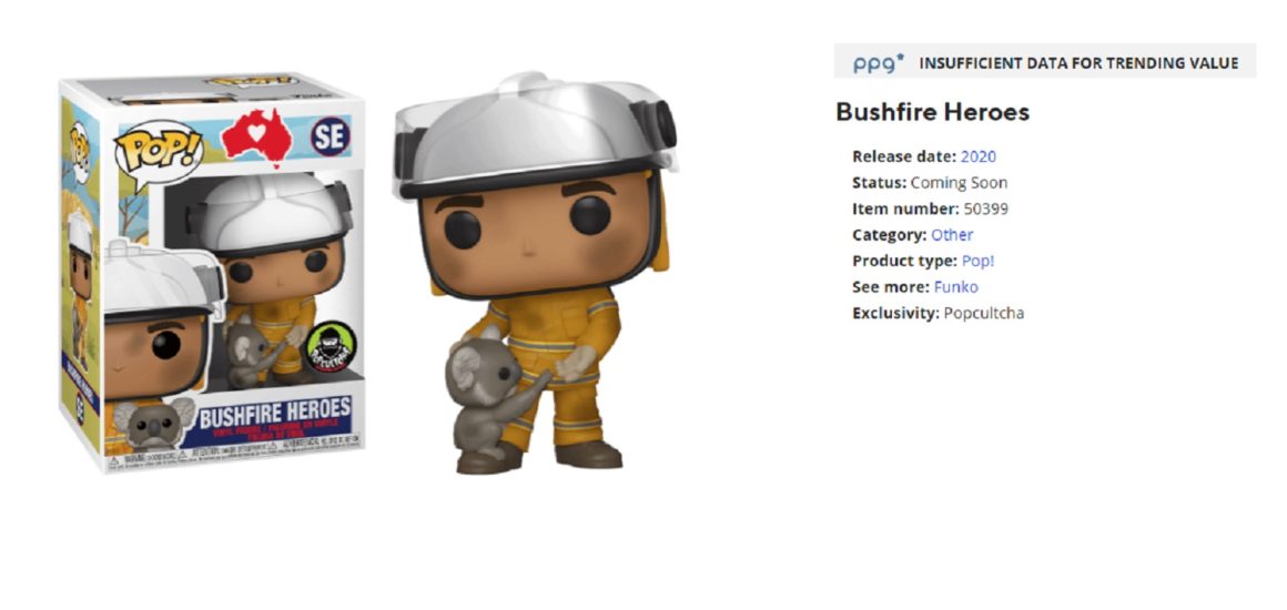 Funko encontró la manera más tierna y divertida de ayudar a los animales de Australia, lanzando uno de sus famosos muñecos Pop! de bombero australiano; donará las ganancias para ayudar a los animales afectados por los incendios. El personaje es un bombero clásico, vestido de amarillo , con su casco y trae consigo un koala rescatado.