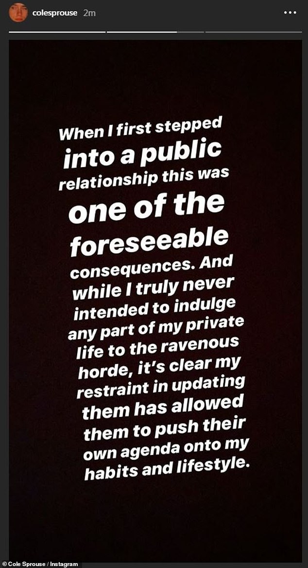 “Cuando entré por primera vez en una relación pública, esta fue una de las consecuencias previsibles. Y aunque nunca tengo la intención de complacer ninguna parte de mi vida privada con la horda voraz, está claro que mi moderación para actualizarlos les ha permitido llevar su propia agenda a mis hábitos y estilo de vida”.