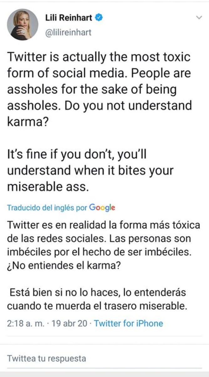 Por su parte Lili Reinhart utilizó su cuenta de Twitter para dar a conocer su sentir, el cual es muy similar al de Cole, aunque quizá un poco menos ‘’explicito’’ en relación a su noviazgo con Cole, pero sí con respecto al Karma.