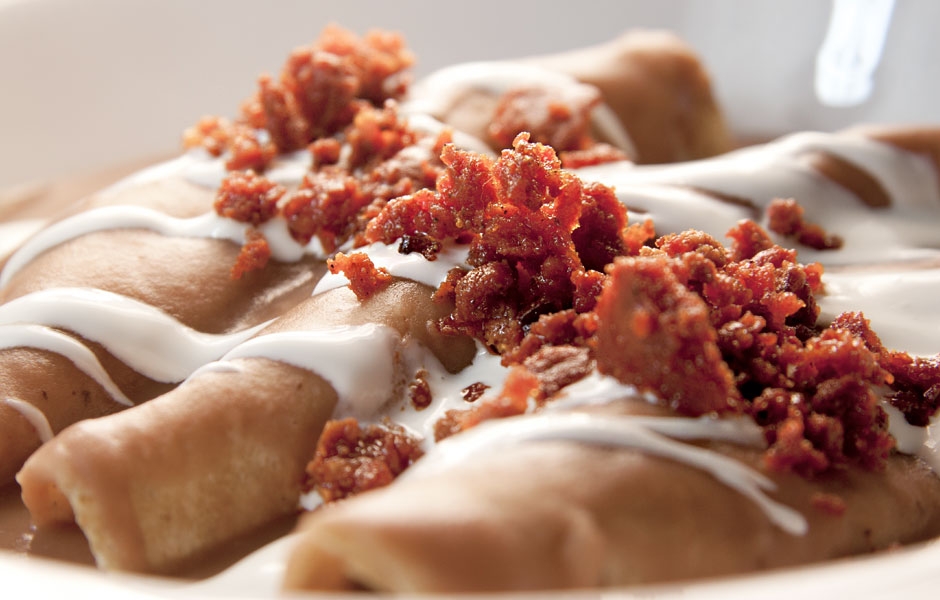 Una vez listas las tortillas las rellenas con pollo y chorizo, las envuelves y las cierras. Al final, a la hora de servir, ponlas en un plato bañadas con la crema de frijoles y decoras con la crema, el queso, cebolla y aguacate.