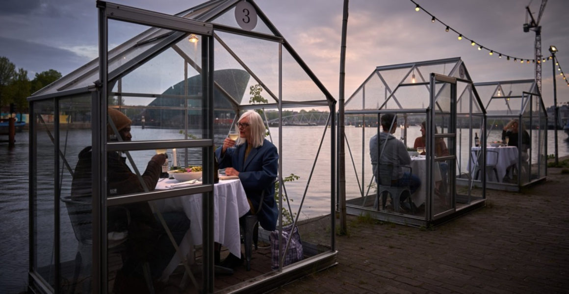 Para cumplir con las actuales normas del distanciamiento físico, este sitio en Holanda implementó en el área de su restaurante “cabinas de invernadero”, que son una versión mini ahora usados para separar a las personas y que puedan convivir sin ningún problema.
