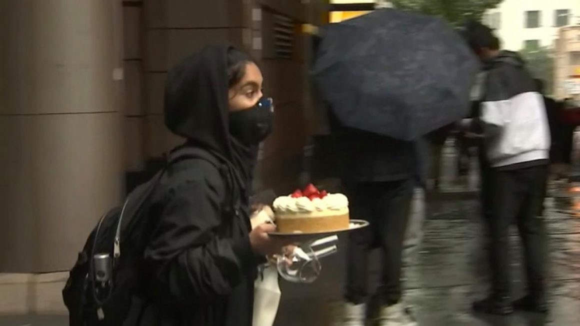 Una mujer fue captada justo en el momento exacto en que sale de la conocida cadena de restaurantes Cheesecake Factory con un pastel en mano. La encapuchada no solo lleva un pastel de queso sino un par de copas de cristal que presuntamente habría tomado del restaurante durante las manifestaciones en Seattle.