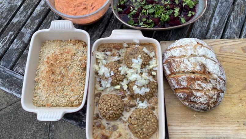 - Estofado de cordero con pastelillos de cebada, cebolla, melocotón, leche y ajo: “El puerro picado y las chispas de ajo le dieron un sabor picante”
