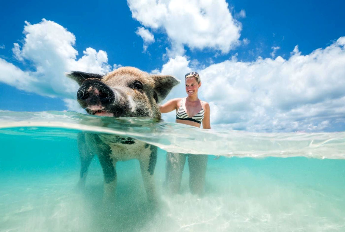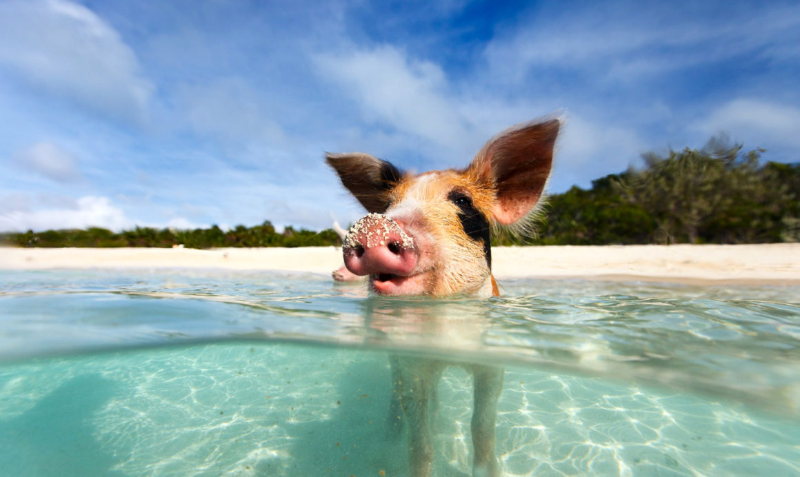 “La pala de los cerdos” (Pig Beach) o también conocida como ‘Pig Island’, es una famosa playa en Bahamas donde hay cerdos nadadores. Además son muy amistosos con los turistas y les encanta refrescarse en el mar.