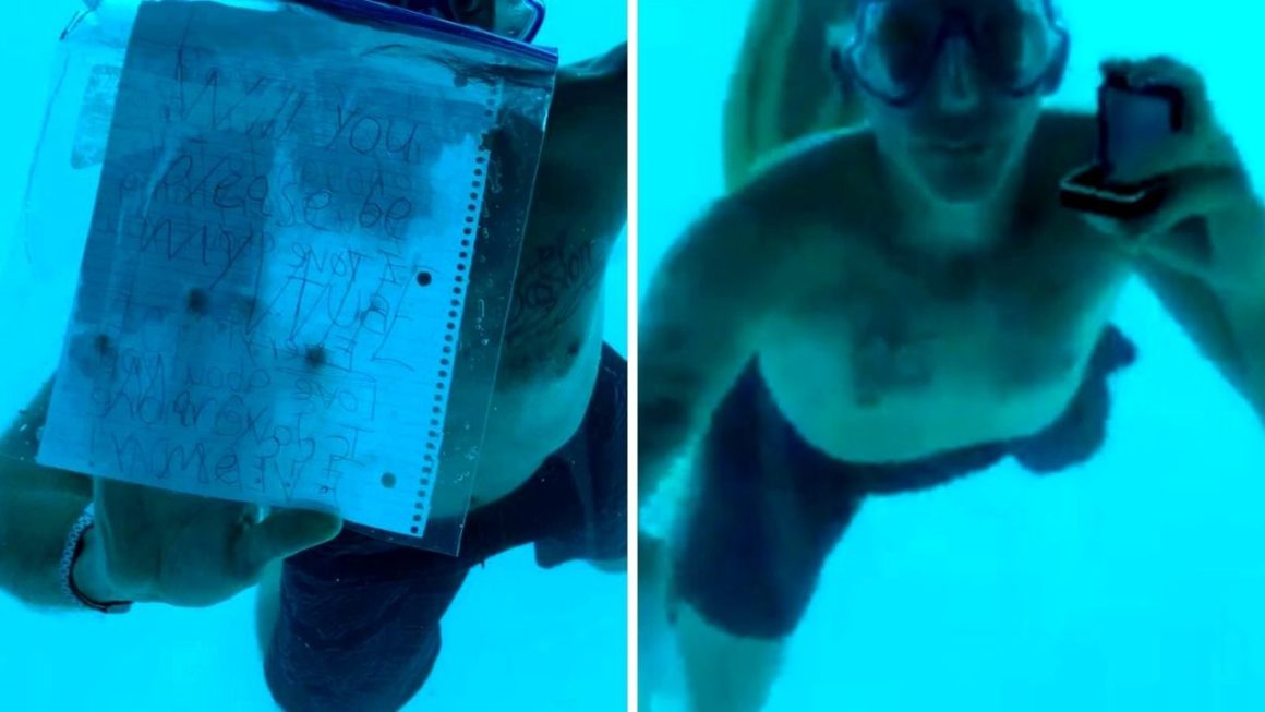 En el video, se ve a Steven sumergido en el agua detrás de un cristal; donde se ve claramente que no lleva un tanque de oxígeno; en seguida, le muestra una carta a su prometida: “No puedo aguantar la respiración lo suficiente para decirte todo lo que amo de ti”, decía el texto en inglés.