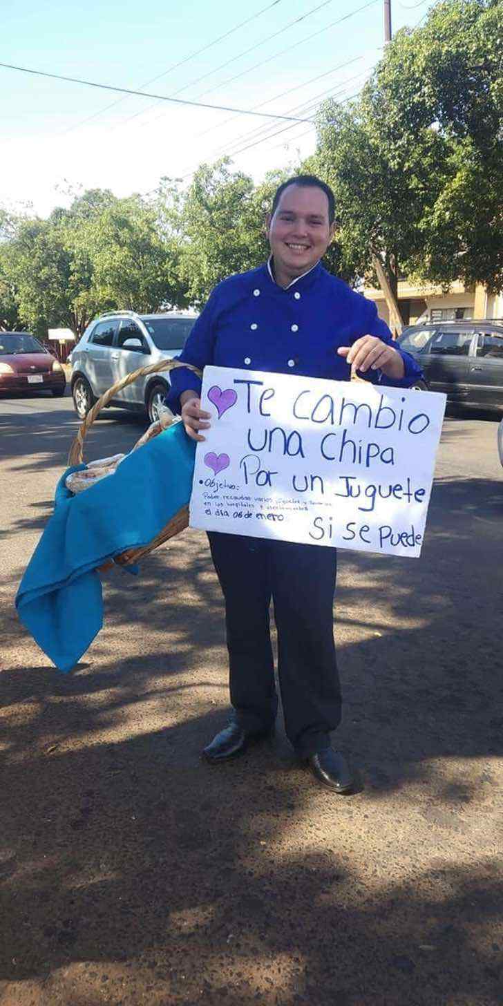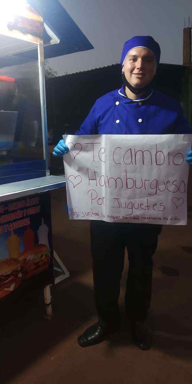 Fue a través de su perfil personal en Facebook que dio a conocer su proyecto “Te cambio hamburguesa por juguetes”. Este proyecto consiste en que hace hamburguesas caseras para dar regalos a los niños de las poblaciones indígenas.