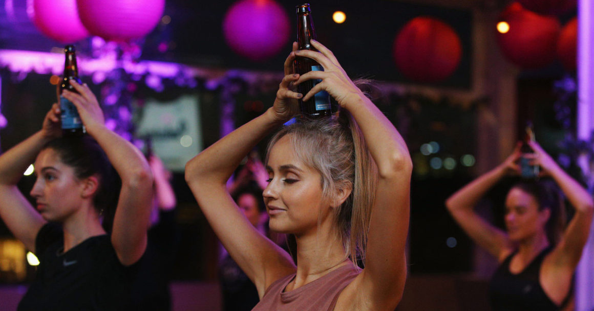 Durante la clase, los participantes realizan diferentes posiciones mientras sostienen una botella de cerveza, y por supuesto tomando un trago cada que puedan. De esta manera, te mantienes activo y motivado.