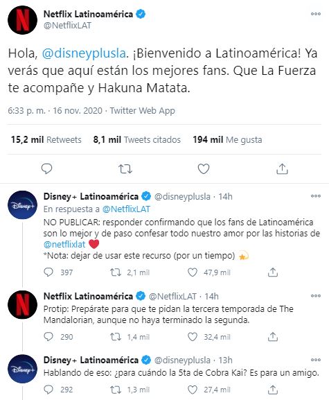 Antes del lanzamiento de Disney+ por Latinoamérica, Netflix envió una solidaria felicitación a la compañía y se declaró fan del contenido que ofrece.