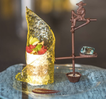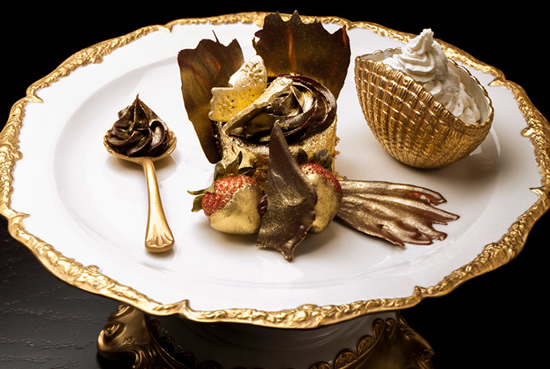 Sultan’s Golden Cake, Estambul, Turquía: Pastel de oro acompañado de higos, peras y duraznos maridados en ron jamaiquino.