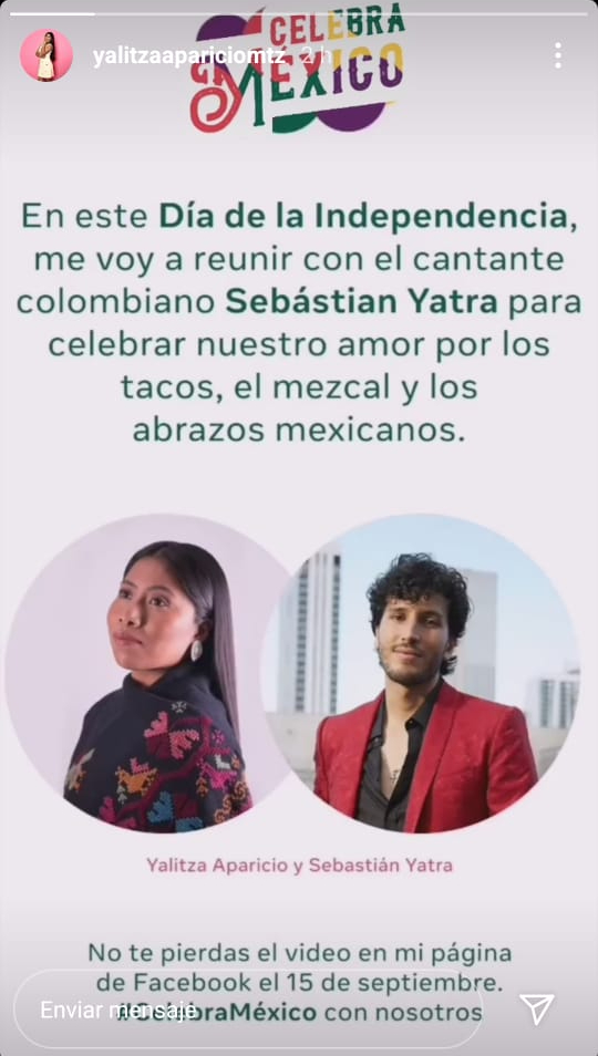 “En este Día de la Independencia me voy a reunir con el cantante colombiano Sebastián Yatra para celebrar nuestro amor por los tacos, el mezcal y los abrazos mexicanos”